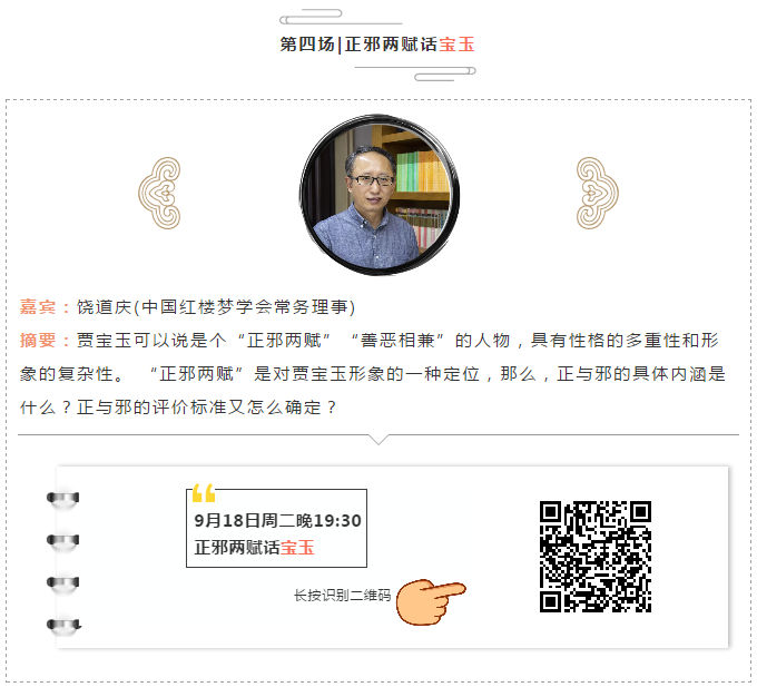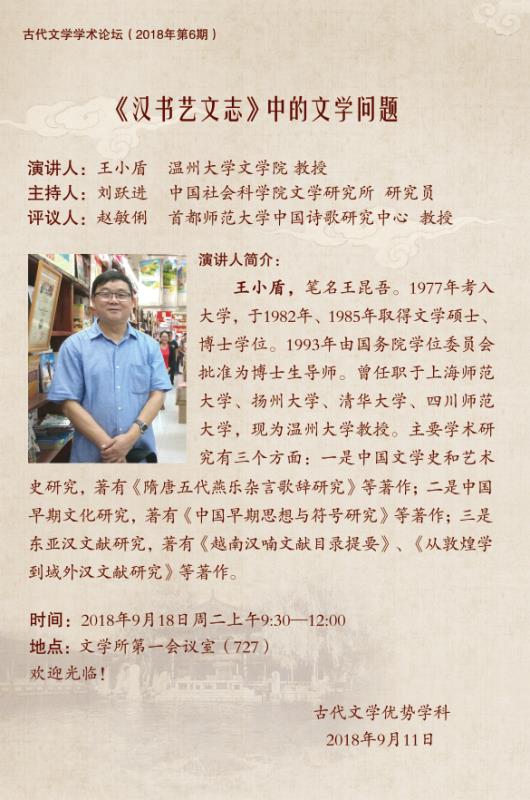 9月18日,对于中国人来说,今天是一个特殊的日子:勿忘国耻,铭记历史。对于九色視頻 来说,今天也是一个值得书写的历史。今天上午9:30-12:00,九色視頻 特聘教授王小盾在中国社会科学院文学所第一会议室主讲古代文学学术论坛第6期 《<汉书艺文志>中的文学问题》。今天下午4:00~5:30王小盾教授将在北京大学人文学苑6号楼B124会议室作题为《从越南的四所寺院看东亚汉籍的生存》的主题报告。今晚19:30开始,中国红楼梦学会常务理事饶道庆教授将在北京的恭王府开讲《“正邪两赋”话宝玉》,这是北京青年报"青睐"线下活动携手恭王府举办"走进红楼梦中人——恭王府与《红楼梦》“主题系列讲座的第四场。