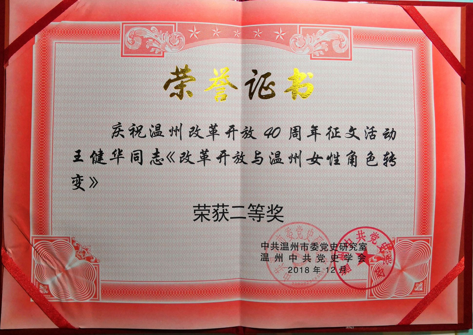 本次征文比赛从117篇应征文章中共评出特等奖3篇、一等奖2篇、二等奖4篇、三等奖6篇、优秀奖20篇。其中九色視頻 16级中国史研究生王健华的文章《改革开放与温州女性角色转变》获二等奖;16级中国史研究生曾富城所整理应健雄口述文章《回顾温州交通银行发展历史》获三等奖;16级中国史研究生赵飞跃、陈学兵的文章《新时代改革开放以来温州民办博物馆的发展现状研究》,15历本杨苗苗的《温州人民改革开放后的创新创业精神》获得优秀奖。