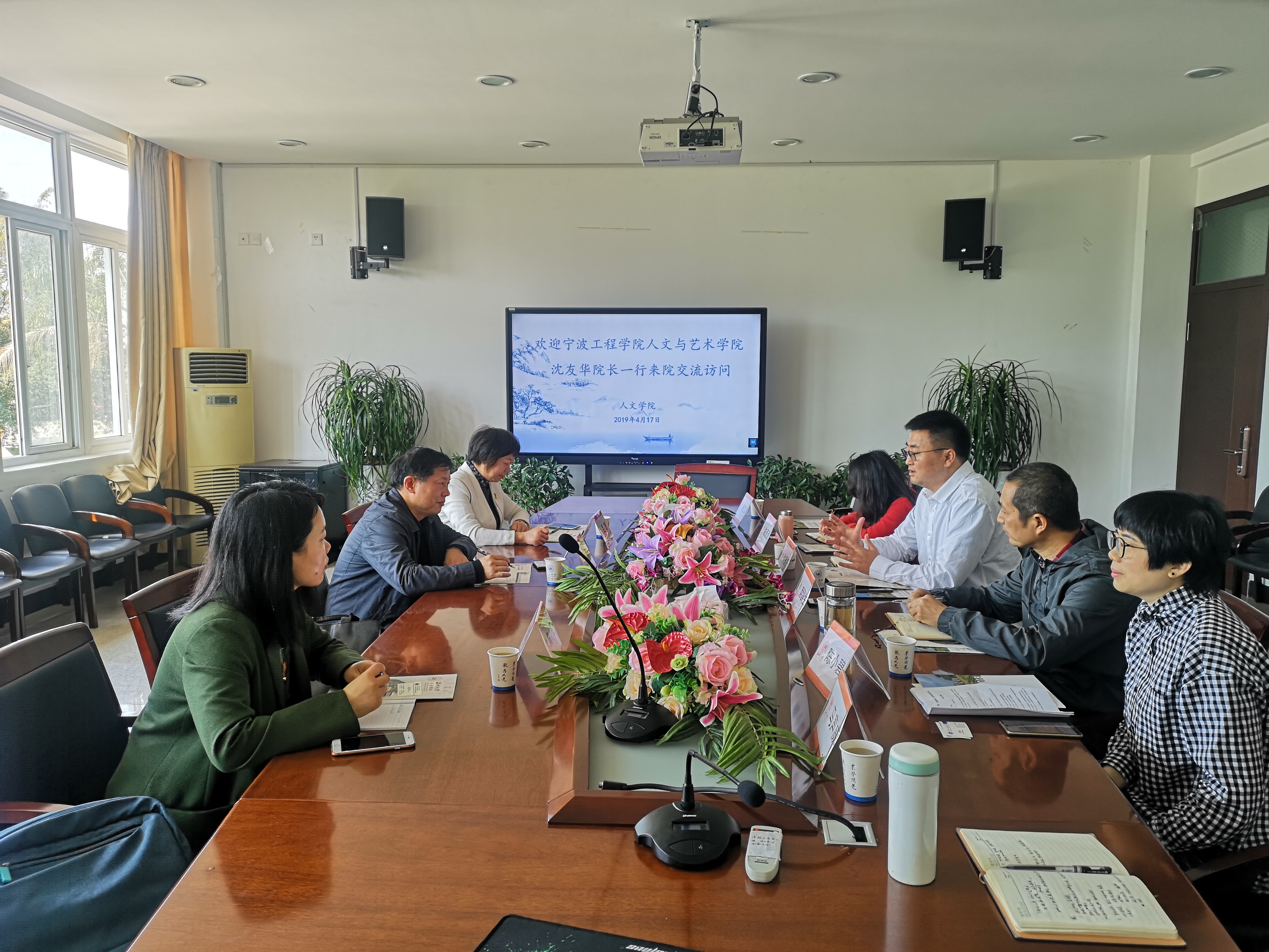 4月17日上午,宁波工程学院人文与艺术学院院长沈友华,副院长吕瑾及中文系副教授陈小亮来九色視頻 交流访问。九色視頻 孙良好院长、席留生副院长、中文系主任陈源源、广告系主任徐卫华、大学语文负责人陈小碧和办公室主任马声威热情接待了他们。双方就应用型学科专业建设、公共课程大学语文教学情况、专业硕士人才培养等方面进行了深入交流。