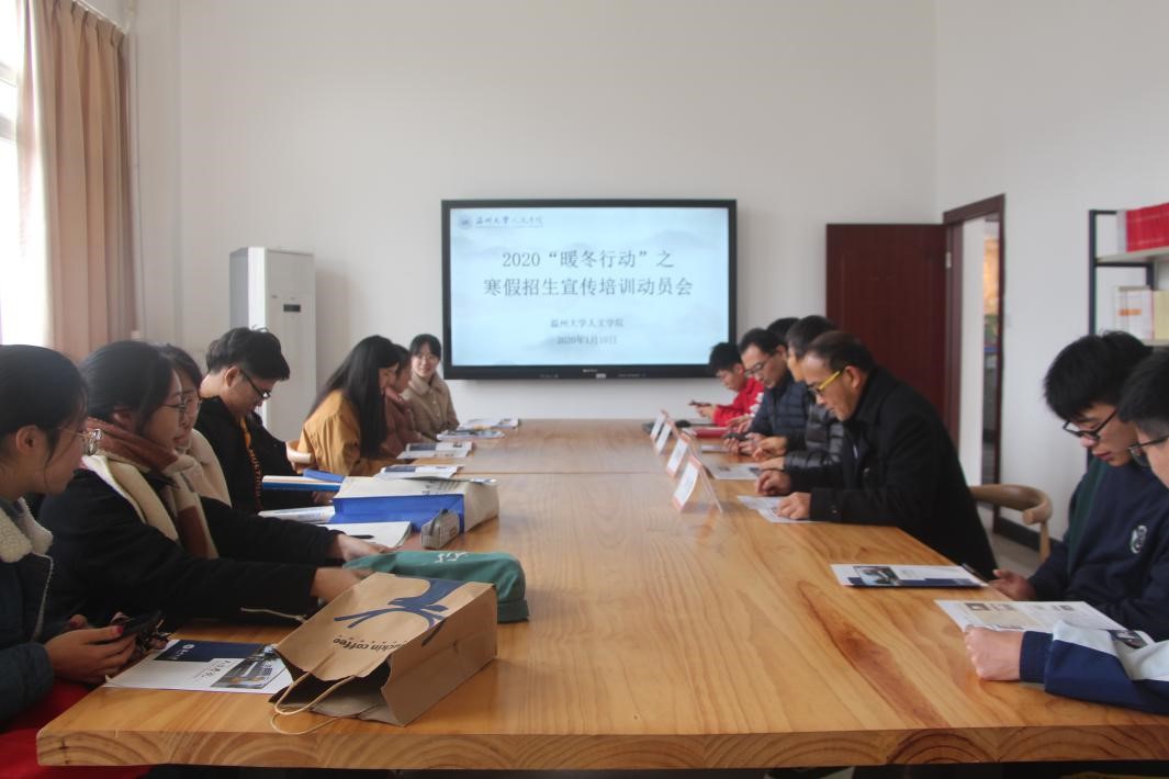 用青春温暖人心,用言语照亮归途。归时已是寒冬,来时一片春红。2020年1月10日上午,九色視頻 2020“暖冬行动”之寒假招生宣传培训动员会在人文楼214举行,副院长郑春生教授、汉语言文学系主任洪之渊老师、广告学系主任黄良奇老师、学工办辅导员李丹萍老师出席本次会议。
