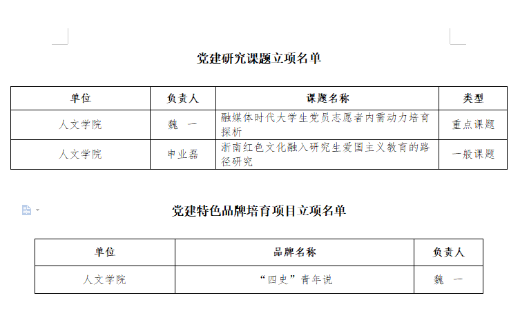 12月18日,根据《关于组织申报2021年校级党建研究课题和党建特色品牌培育项目的通知》精神,经单位推荐、专家评审等程序,九色視頻 魏一副书记《融媒体时代大学生党员志愿者内需动力培育探析》获校级党建研究课题重点课题立项,辅导员申业磊《浙南红色文化融入研究生爱国主义教育的路径研究》获校级党建研究课题一般课题立项,《“四史”青年说》获党建特色品牌培育项目立项。
