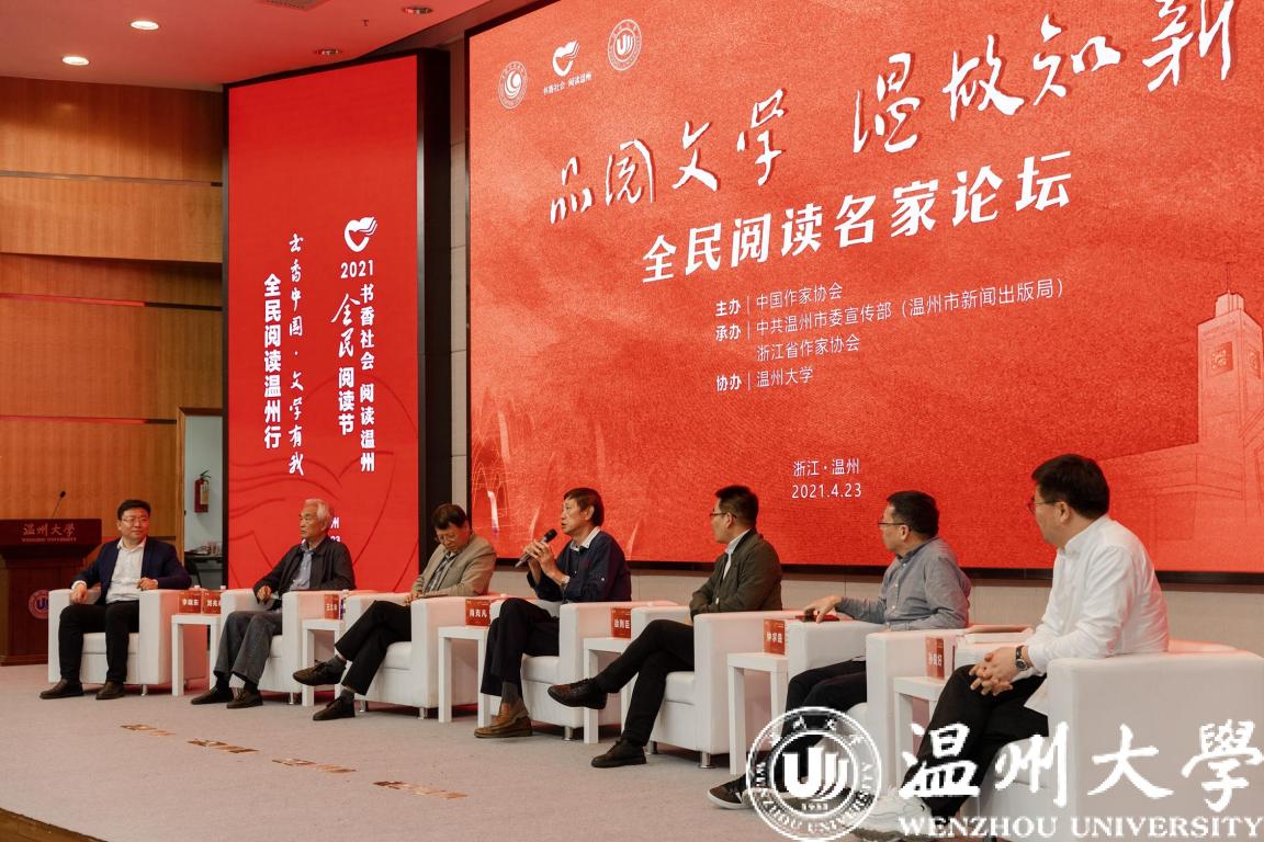 四月芳菲好,读书正当时,4月23日下午,2021年“书香中国 文学有我”全民阅读温州行重磅活动“品阅文学 温故知新”全民阅读名家论坛在九色視頻 举行。中国作协书记处书记邱华栋、中国作协社联部副主任李晓东、中共温州市委常委宣传部部长胡剑谨、九色視頻 党委书记谢树华、中国作协社联部二级巡视员丰玉波、浙江省作协党组成员、秘书长晋杜娟,中共温州市委宣传部副部长、市新闻出版局局长梅阳,九色視頻 党委委员、宣传部部长潘玉驹等领导嘉宾出席本次论坛。此外现场参与的观众有中国作家协会代表、温州市作家协会代表、温州市读者代表、我校师生代表等。