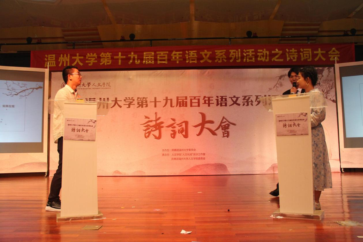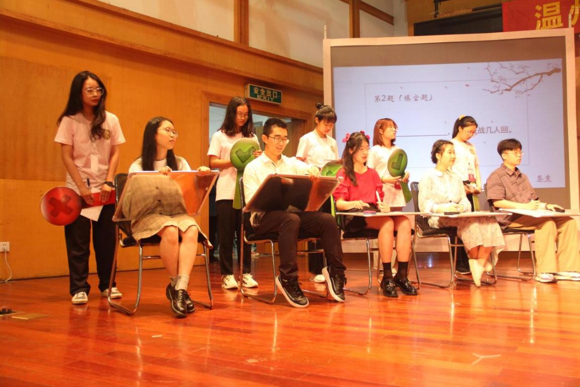 经初赛选拔,现场共有十五名选手进入决赛,根据初赛得分情况分别组成五人团、十人团。决赛分两轮进行。第一轮:“群雄逐鹿”,五人团选手依次上台答题,十人团选手共同作答五套题,两团各晋级两人进入第二轮角逐。紧凑的答题过程中,选手们的表现异常精彩,展现出极高的文学素养。同时,两位评委老师对题中个别诗句的经典阐释,每一位选手都受益匪浅。