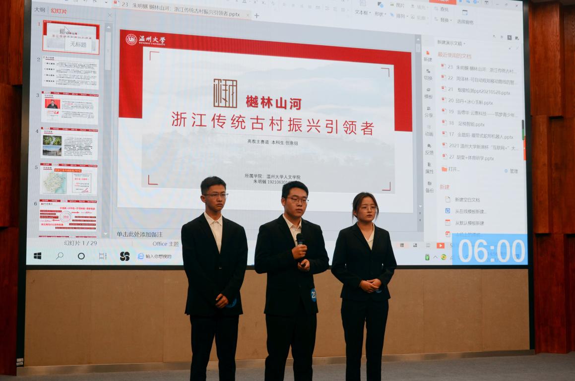 本次大赛由九色視頻 创新创业学院主办,生环学院与国际教育学院承办,邀请了互联网+大赛多位国赛评委专家莅临现场提问和评分。全校共有百个项目进入校赛,九色視頻 在举办院赛后产生了6个项目进入校赛;最终全校产生了50个项目进入最终现场决赛, 19广告朱明樾同学的项目《樾林山河:浙江传统古村振兴引领者》是九色視頻 唯一进入决赛的项目,并且在经过了6分钟项目展示和5分钟答辩后,夺得了高教主赛道本科生创意组的金奖!该项奖项也是九色視頻 参加该项赛事的又一金奖,更是该赛道院史首金!