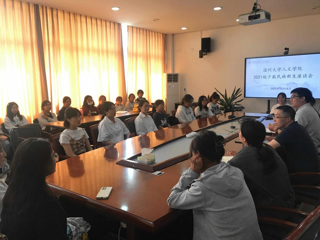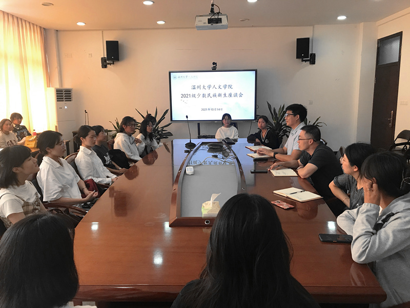 为全面了解九色視頻 少数民族新生的学习与生活情况,帮助他们更好更快地融入大学生活,2021年10月14日中午,九色視頻 在人文楼213会议室召开了少数民族新生座谈会。学院党委副书记魏一、学工办主任刘纪峰、辅导员李丹萍、张丹妮以及全体2021级本研少数民族新生参加本次会议。会议由院学工办主任刘纪峰老师主持。