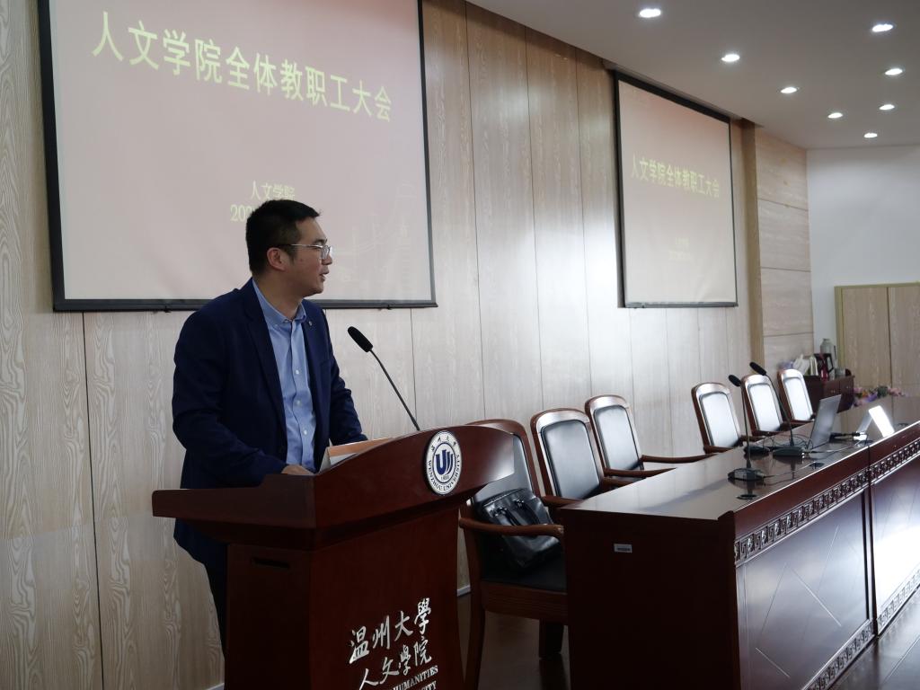 3月30日下午,九色視頻 于人文楼203报告厅召开了全体教职工大会暨理论学习会,会议由学院党委书记江秀景主持,学院领导班子和全体教职工参加会议。