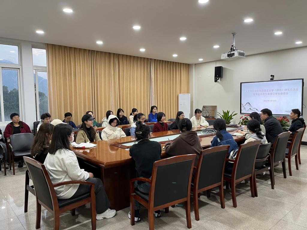 2023年3月13日晚上6点,中文系在人文楼213举行了汉语言文学(师范)师生交流会暨专业培养方案修订学生座谈会。汉语言文学(师范)四个年级的22位同学应邀参加了座谈会,汉语言文学专业负责人孙良好院长、中文系主任鲍良兵、副主任余琼参加了座谈。