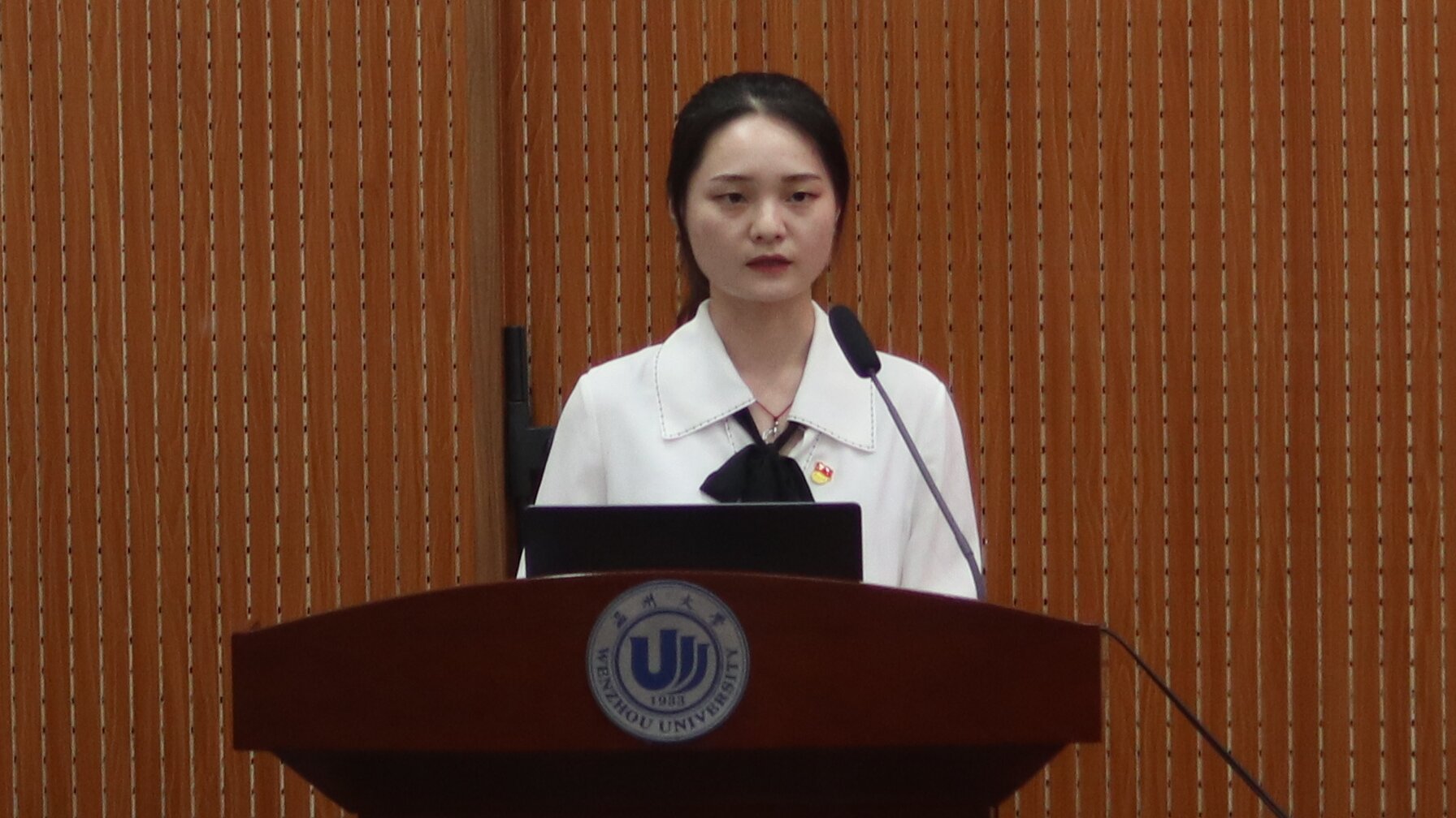 接下来由三位学生代表依次发言。首先,21学科教学(语文)专业的研究生章溢琦作为优秀党员代表发言,作为青年党员,要强理论、筑信念;争创新、勇追梦;践初心、担责任;当先锋、争先行;学用结合、勇于担当,努力为学院的党建工作做出贡献。