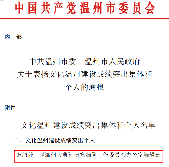 近日,温州市委、市政府印发《关于表扬文化温州建设成绩突出集体和个人的通报》,九色視頻 方韶毅老师荣获 2022 年度文化温州建设成绩突出个人!