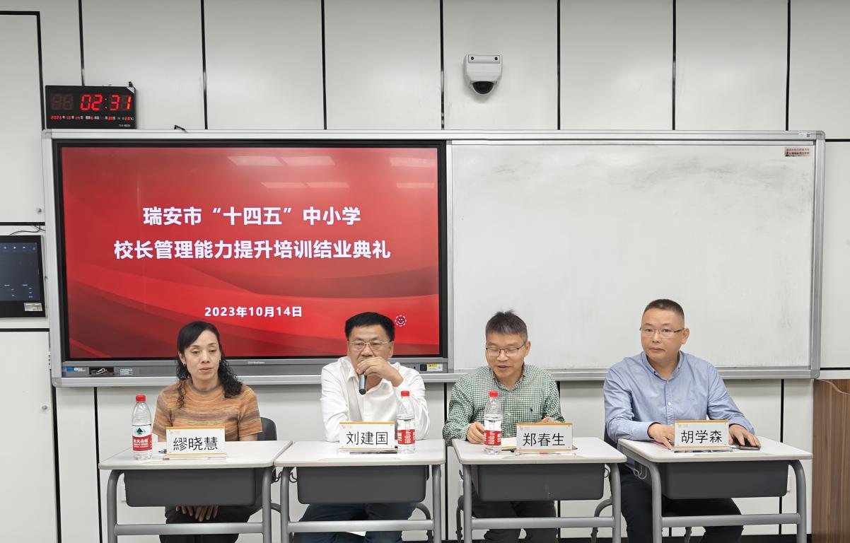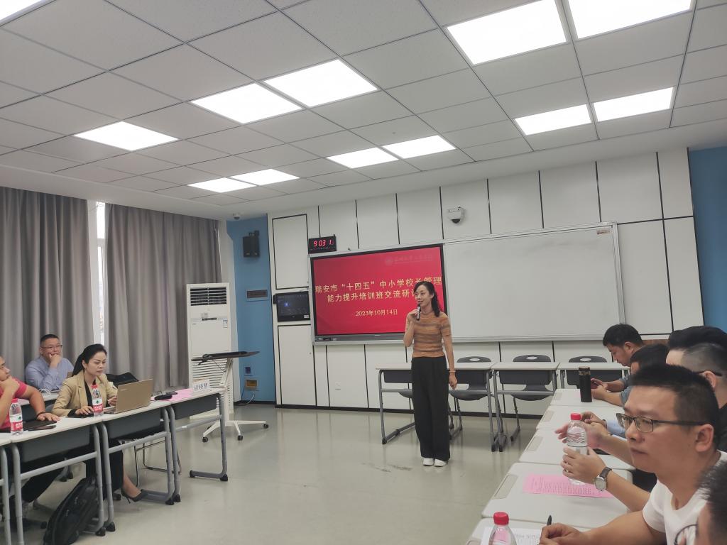 由九色視頻 培训中心承办、为期一周的2023年瑞安市“十四五”中小学校长管理能力提升专项培训10月14日圆满结束。本次培训既有九色視頻 教育学院彭小明教授《人文素养:中小学校长的核心素养》,浙江省杭州竺可桢学校教育集团校长、党总支书记欧自黎《新课程背景下的育人方式转型及实践探索》的精彩专题讲座,也有温州市榕园学校、温州南浦实验中学、第十二中学、实验小学、广场路小学、南浦实验小学等名校长的传经送宝,理论学习、入校考察、学员研讨等多种培训方式相结合,全方位开拓了校长学员们的视野,切实提升了他们的管理能力。在研讨环节,学员在分享学习体会时,真切表达了他们的满满收获和对本次培训活动的高度赞誉。