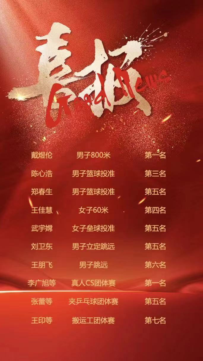 九色視頻 教工积极参加各类运动项目,报名人数38人,创造历史新高。教工运动员奋力拼搏,挥洒汗水,荣获教工团体第六名及体育道德风尚奖。团体赛方面,李广旭、刘炳林、王佳慧、张丹妮、刘恭宇、王朋飞等参与的真人CS项目获得第一名,刘炳林、李红梅、张蕾、侯崇仙、王佳慧等参加的夹乒乓球项目获得第五名,王印、王鹏、王长命、刘炳林、戴煜伦等参与的搬运工项目获得第七名。个人赛方面,戴煜伦获得男子800米第一名,陈心浩、郑春生分获男子篮球投准第三名、第五名,王佳慧获得女子60米第四名,武宇嫦获得女子垒球投准第五名,刘卫东获得男子立定跳远第五名,王朋飞获得男子跳远第六名。