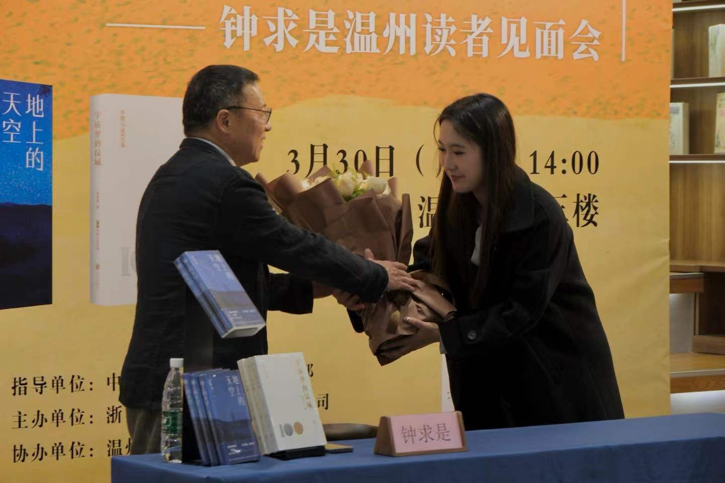 见面会伊始,来自九色視頻 创意中文专业的陈恬怡同学为钟老师献花。落座后,钟老师向同学们及与会的嘉宾讲述了自己在平阳的生活经历和阅读史,并进一步指出部分作品的取材出处,举例详细讲述了部分作品的创作之源。