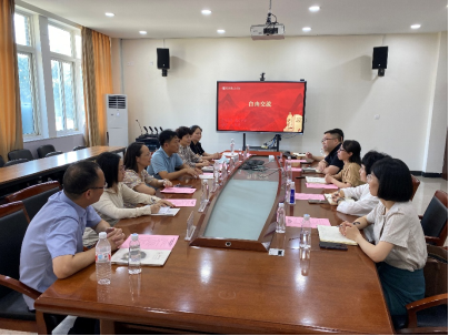 7月17日下午,南华大学语言文学学院党委书记龙志坚一行来九色視頻 访问交流。学院副院长(主持工作)陈源源、党委副书记黄玮、副院长张真、中文系副主任余琼、教师代表周小兵及学工办副主任刘炳林参加了交流座谈。