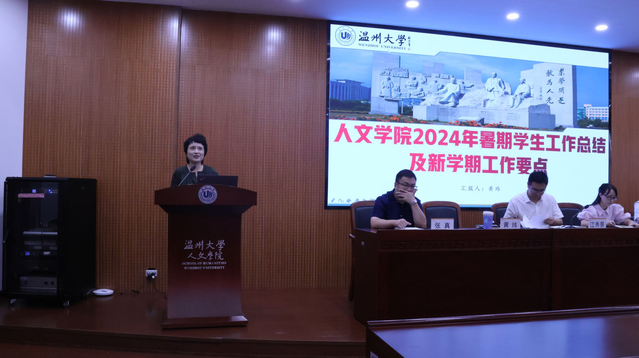 黄玮副书记进行了暑期学生工作总结及新学期工作重点部署。黄玮副书记首先从“就业工作”、“社会实践”、“校友工作”、“家校联系党建推进”、“迎新工作”、“学风建设”等六个方面对暑期工作的显著成果进行了详细总结,这些成果的取得离不开全体师生的共同努力。随后,黄书记详细部署了新学期的工作重点。她强调新学期学院要持续做好“党建+榜样培育”工作,让学生成长站位更高;坚持开展“团学+文化品牌”,让学生成长视野更广;加大“考研+就业服务”力度,让学生成长平台更强。