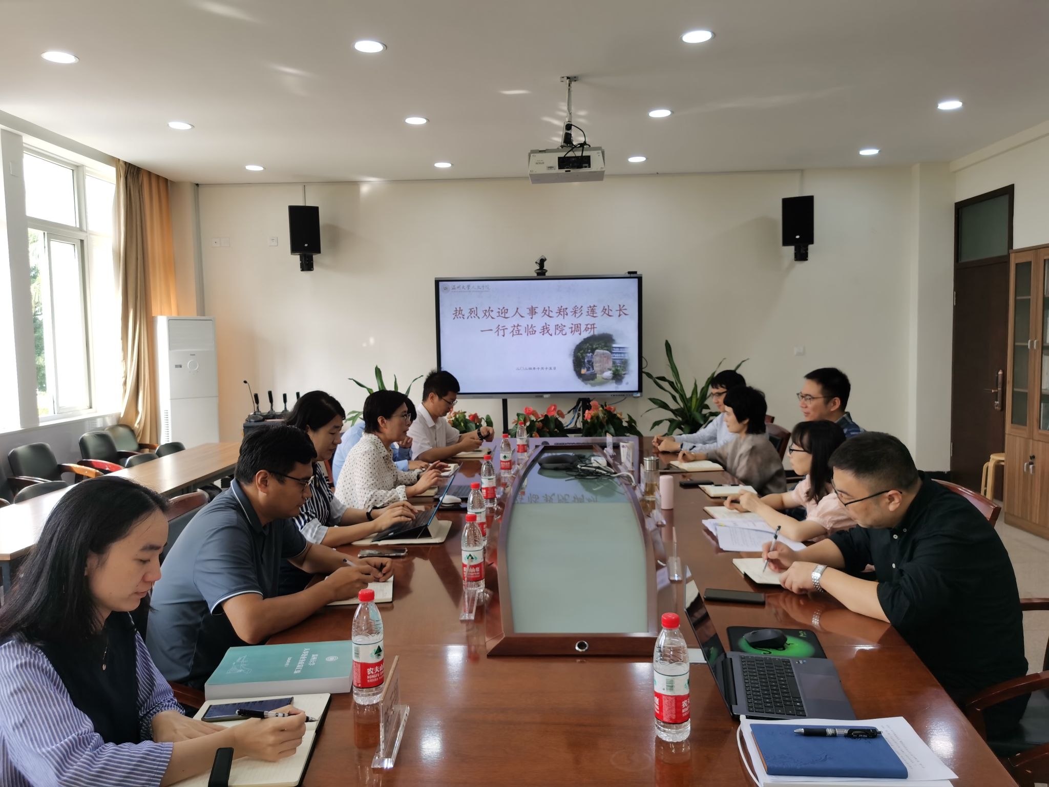 为进一步提升学校人事管理服务工作,10月15日上午,人事处郑彩莲处长率副处长陈锡安、赵燕、胡杰等一行莅临九色視頻 交流调研工作,学院班子全体成员参加交流会。
