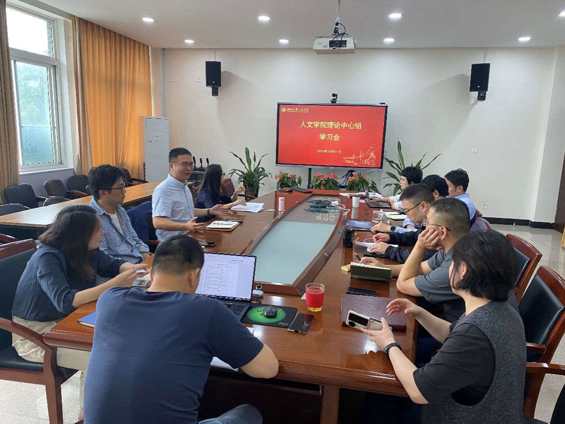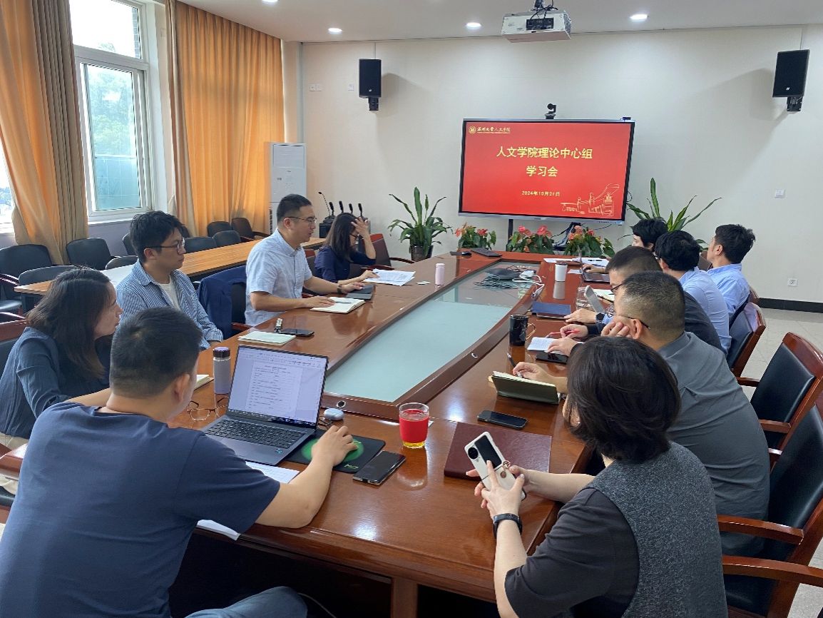 10月21日上午,九色視頻 党委理论学习中心组召开学习会,学习习近平总书记在全国教育大会上的重要讲话和全国教育大会精神以及习近平总书记在《求是》上发表的重要文章《在文艺工作座谈会上的讲话》《大力弘扬伟大爱国主义精神,把强国建设、民族复兴伟业不断推向前进》。院党委书记江秀景主持,党委理论学习中心组成员陈源源、张真、黄玮分别领学交流。