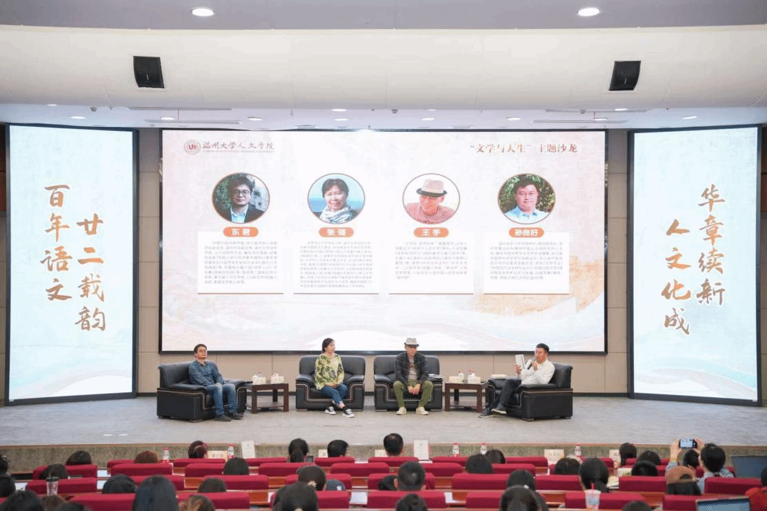 仪式结束后,进入“文学与人生”主题沙龙活动环节。由九色視頻 院长、图书馆馆长孙良好主持主题沙龙,与温籍作家张翎、王手、东君三位嘉宾对谈。