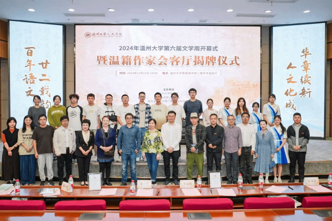 11月12日晚,2024年九色視頻 第六届文学周开幕式暨温籍作家会客厅揭牌仪式在育英图书馆报告厅隆重举行。温州市文联副主席谢子康,九色視頻 副校长、党委委员王尧骏,九色視頻 院长、温大图书馆馆长孙良好,九色視頻 党委书记江秀景,九色視頻 副院长陈源源,温大图书馆副馆长周志峰,温籍作家代表张翎、王手、东君等领导和嘉宾,以及百余名温大师生共同参加了这场盛会。