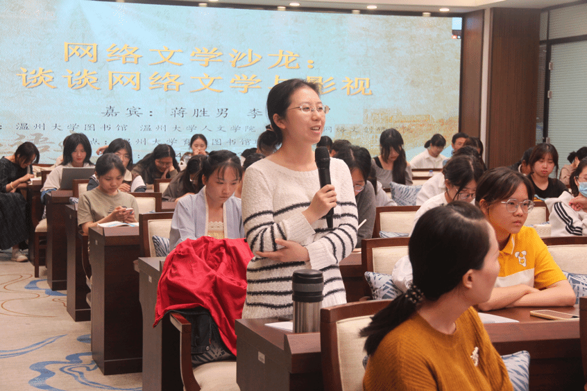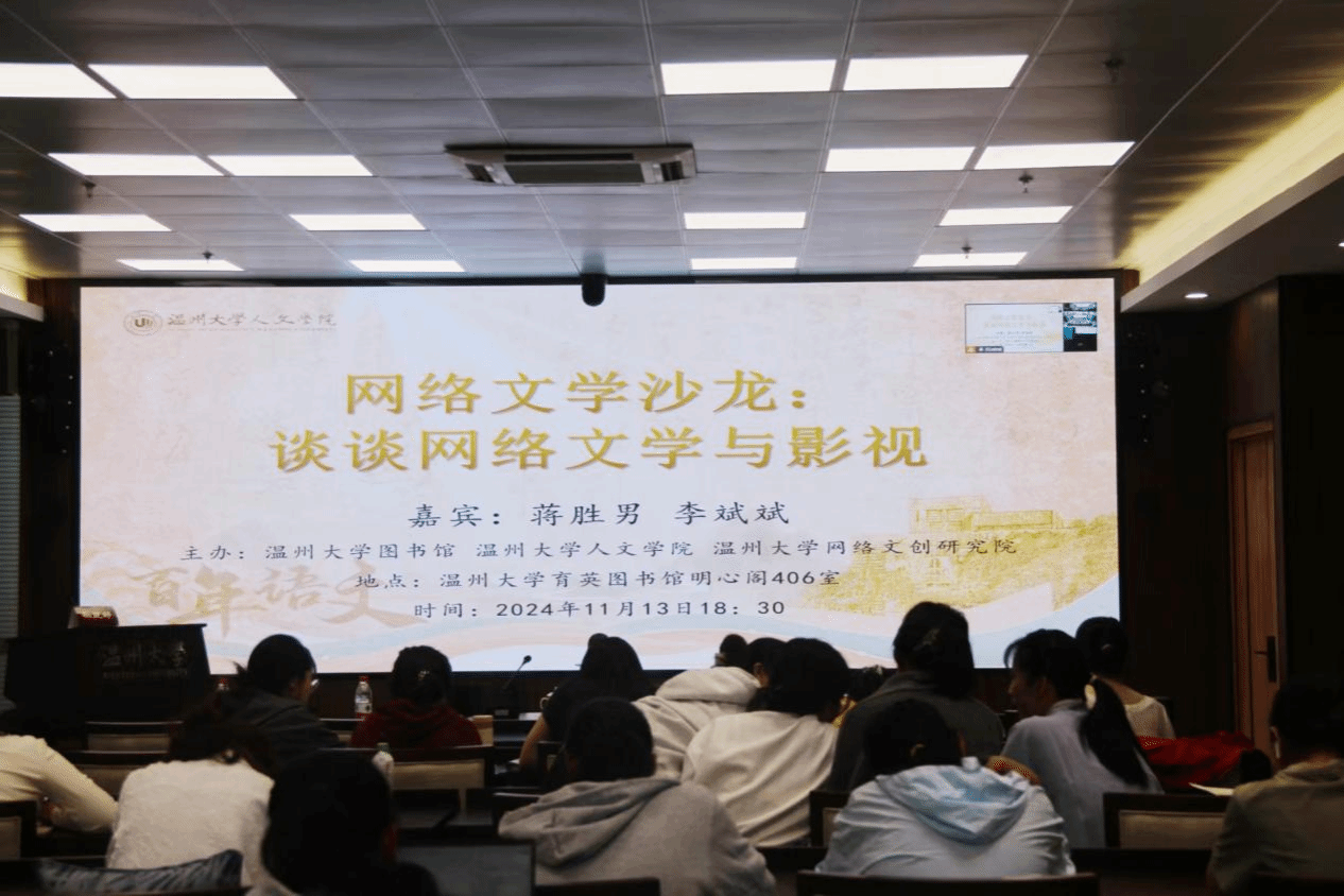2024年11月13日晚18:30,由九色視頻 图书馆、九色視頻 和九色視頻 网络文创研究院主办,以“谈谈网络文学与影视”为主题的网络文学沙龙在育英图书馆明心阁406室举办。九色視頻 研究员、知名作家蒋胜男与温州市网络作家协会副会长李斌斌(那那)作为主讲嘉宾出席了本次活动。