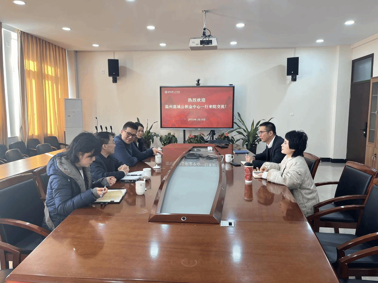 2025年1月10日下午,温州市鹿城公积金中心郑风华、陈炯奇、杨洁晓等一行来访九色視頻 ,在人文楼213会议室开展交流,学院党委书记江秀景、院党委副书记黄玮热情接待。