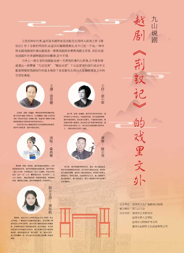 11月20日上午,新九山书会公益培训课程第二讲“越剧《荆钗记》的戏里文外”主题沙龙在南戏博物馆内和广大戏剧爱好者如期见面。本次活动由国家一级编剧、浙江省文联副主席、温州市文联主席张思聪老师主讲,温州市艺术研究所所长、新九山书会会长施小琴和九色視頻