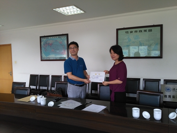 2016年9月21日下午2点,九色視頻 夏雨禾副院长、学科教学(语文)硕士点负责人陈柳老师、硕士生导师赖学军老师,带领九色視頻 学科教学(语文)教育硕士专业的两位研究生来到瑞安中学,参加九色視頻 教育实践基地授牌和实习计划启动仪式,开始为时一个学期的教育教学实习。