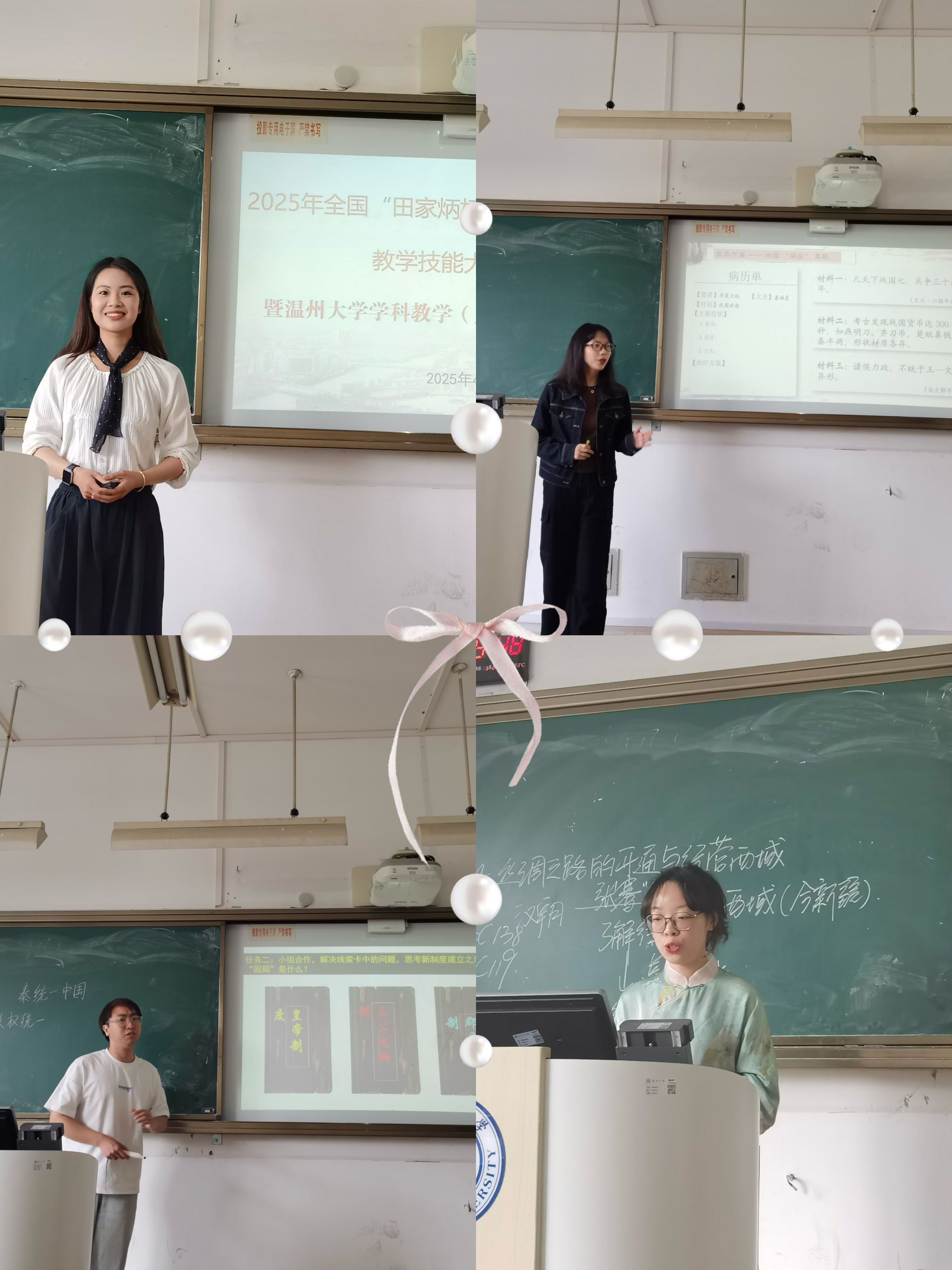本次竞赛,参赛选手按照竞赛要求开展实战演练,在10分钟内完成片段模拟授课。比赛过程中,选手们展现出了扎实的专业知识和出色的教学基本功,他们教态自然大方,语言表达清晰流畅,教学设计新颖独特,注重学生的主体地位,采用多种教学方法激发学生的学习兴趣。有的选手通过生动的历史故事导入课程,迅速吸引学生的注意力;有的选手运用多媒体资源,利用AI技术使历史人物“动起来”,让历史知识更加直观形象;有的选手组织课堂讨论,引导学生积极思考,培养学生的历史思维能力和合作探究能力。经学位点尤育号、郑春生等五位老师组成的评委小组的综合评审,本次竞赛共评出一等奖5人,二等奖7人,三等奖7人,潘安妮、蔡超颖、钱欣璐、陈思琦、郑浩敏等5位同学被推荐为“田家炳杯”全国学科教学(历史)专业研究生教学技能大赛参赛选手。