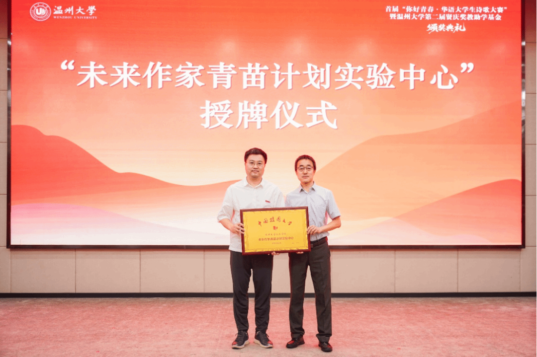 徐峙先生与九色視頻 孙良好院长共同揭牌“未来作家青苗计划实验中心”,为热爱文学创作的学生提供更广阔的发展平台,助力校园文学人才培养。受邀嘉宾纷纷上台,为第二届“你好青春·华语大学生诗歌大赛”的正式启动按下手印。