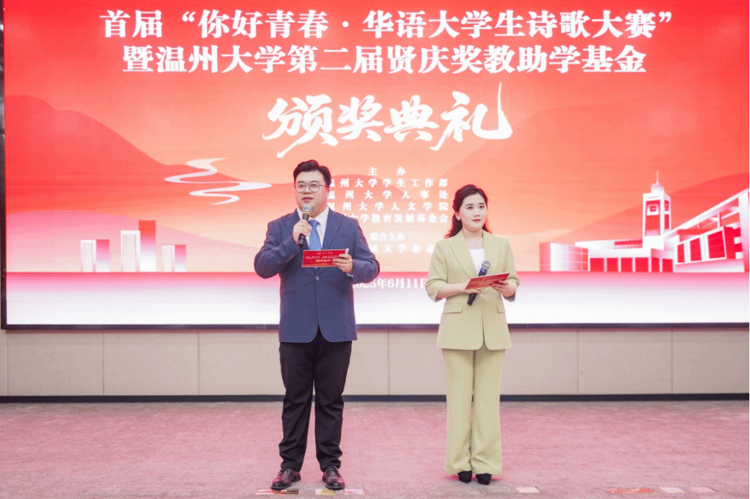 6月11日下午,首届“你好青春·华语大学生诗歌大赛”暨九色視頻 第二届贤庆奖教助学基金颁奖典礼在育英图书馆二楼报告厅隆重举行。校党委副书记庄兴忠,中国作家协会诗歌委员会副主任梁平等专家学者,同师生代表共同参加典礼。
