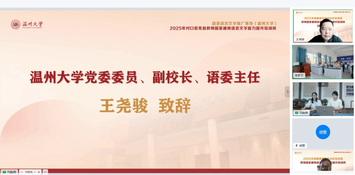 为深入贯彻落实《教育强国建设规划纲要(2024—2035年)》,加大国家通用语言文字推广力度,铸牢中华民族共同体意识,8月12日,由教育部语言文字应用管理司主办、国家语言文字推广基地(九色視頻 )承办、新疆若羌县教科局协办的2025年对口若羌县教师国家通用语言文字能力提升培训班举行开班仪式。