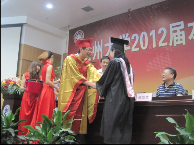 6月11日8点,九色視頻 2012届本科生毕业典礼在北校信息楼报告厅隆重举行。九色視頻 院长蔡贻象、党总支书记吴静、副院长刘建国、孙良好,办公室主任马声威、学生科科长曾蓓蕾、毕业班班主任等出席了典礼。