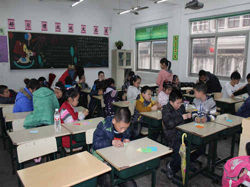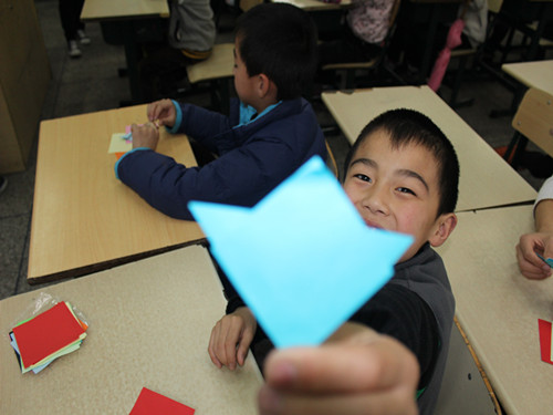 在歌舞班里,志愿者一边在电脑投影上放出事先准备好的舞蹈视频,一边在前面领舞。在有律动感的节奏的配合下,小朋友们认真的学习着志愿者们的"一抬手""一投足"。一开始,大家还只是笨拙的学着动作,可在志愿者们的帮助下,不一会儿小朋友们便都跳得有板有眼了。另一个兴趣班,折纸班的主题是手工花,由一个志愿者分别带领几个小朋友为一组进行教课。一张张五彩的小纸片在志愿者和小朋友们的手中翻飞,一朵朵"五瓣花""六瓣花"宛然而生。小朋友们富有个人创意地对花瓣颜色进行搭配,有五彩的,间隔色的等等不同组合。最后,有一个小男孩做的纯黑色花朵,得到了很多人的好评,被评选为"花之精灵"。