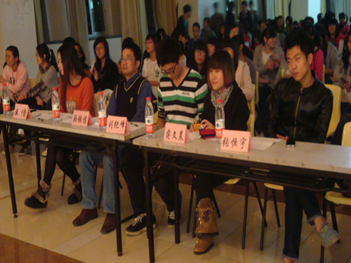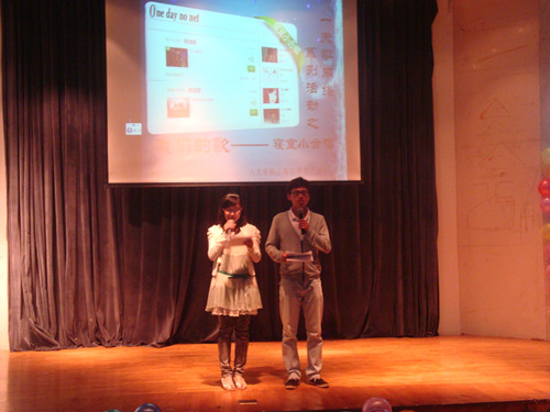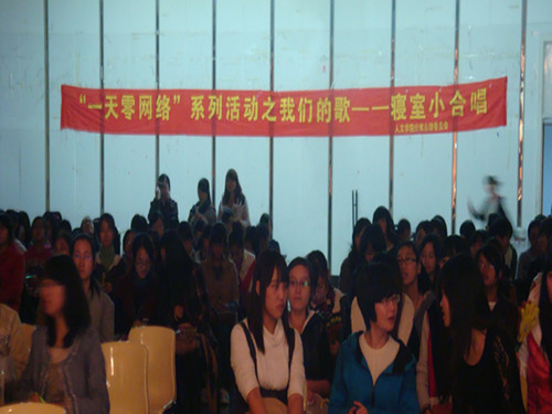 一天零网络系列活动之"我们的歌--寝室小合唱"决赛在大学生活动中心多功能厅拉开了序幕。来自音乐学院的评委王倩和九色視頻