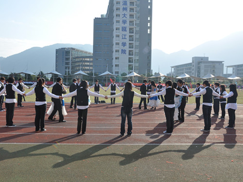 的拼搏之旅吹响启程的号角。雄纠纠气昂昂,运动员们在主席台前立定。随着一声"人"字响起,运动员们迅速就位,飞快地排成了"人"的形状,生动形象。两边的横幅拉开"路漫漫其修远兮,吾将上下而求索"不禁让人眼前一亮。接着,人文学子们又以迅雷不及掩耳之势在"文"声中摆出了"文"字造型,干净利落。这时候,出乎意料的事发生了。"太极"声响起,队员们再一次开始迅速变换队形。人刚站毕,"变",大家迅速脱去外面的粉色院服。黑白长袖映入眼帘,逼真的造就了"人文太极"!"文韬武略,扬我人文"的口号雄浑响亮的在操场上空回荡,经久不息。观众席上顿时爆发出雷鸣般的掌声和阵阵喝彩。