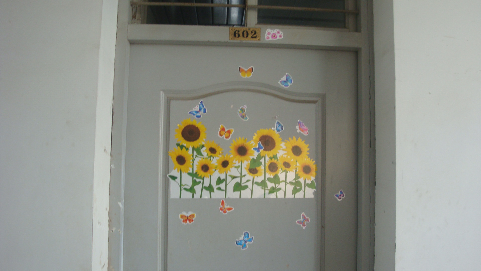 据悉,本次大赛共有四个主题“温馨”,“个性”,“时尚”,“浪漫”。我们首先来到了1512的寝室门口,只见门上用漂亮的艺术字体描绘了三个橘黄色的大字:葵语轩,旁边橘红色的阿狸瞪大了眼睛看着来访的客人。随着应门的声音,一位学姐热情地带领我们走了进去。一进门便被一种温馨的氛围包围着。只见四个床位用了统一的粉红色蚊帐,白底上点缀着一朵 朵花,上面挂满了粉色的气球。不仅如此,墙上,柜子上都有手绘的图案,评委们都情不自禁的啧啧称赞。