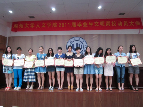 院长丁治民老师为大会致辞。丁院长对毕业生表示祝贺,介绍了2011届毕业生的毕业情况并对毕业生的未来提出了几点期望。丁院长指出,作为温大毕业生应该情系祖国,热爱生活;树立远大的理想,敢于勇往直前,胆的创新; 与人为善,孝敬长辈;树立起"终生学习"的目标;珍惜友情,爱校容校等。接着,刘院长宣读省优、校优、院优秀学生,饶院长科研创新奖获奖名单。然后,在大家热烈的祝贺中,大会颁发了颁发院优、科研创新奖荣誉证书。最后,周剑平书记进行文明离校动员讲话。周书记强调要文明离校重要性,要求毕业生认真填写自我鉴定,有效地为学生分析当前的就业形势并对毕业生表示真诚的祝愿。