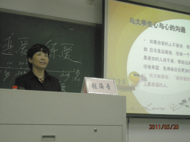 辅导员叶豪芳老师代表发言并对张海音老师的到来表示欢迎,接着张老师针对当代大学生在感情上遇到的困惑,告诉大家正确对待爱情对大学生心理健康教育的重要性。张老师从“爱情是什么”“恋爱心理的形成与发展”“大学生健康的恋爱心理与行为的培养”和“如何培养爱的能力”四个方面具体为大家分析了大学生恋爱的种种不同的心理,她强调对于大学生来说由于求异、空虚、虚荣、好奇、从众等不同的心理,导致许多学生并不能正确对待自己的爱情,分不清友谊与爱情,而且不能做到对自己的感情负责任,不能正确对待恋爱与婚姻的关系。张老师拿出自己平时在心理健康教育中心遇到的具体个案与大家一起分享和讨论,并且从自己之前做的问卷调查结果中总结出大学生应该如何正确认识自己的爱情,之后老师还与大家进行了互动,更加有针对性地为大家解决心中的困惑,指明感情生活的方向。最后在热烈的掌声中,张海音老师将“恋爱是艺术家,失恋是哲学家,每个人都应该认真经营自己的感情”送给在场的每一位同学。