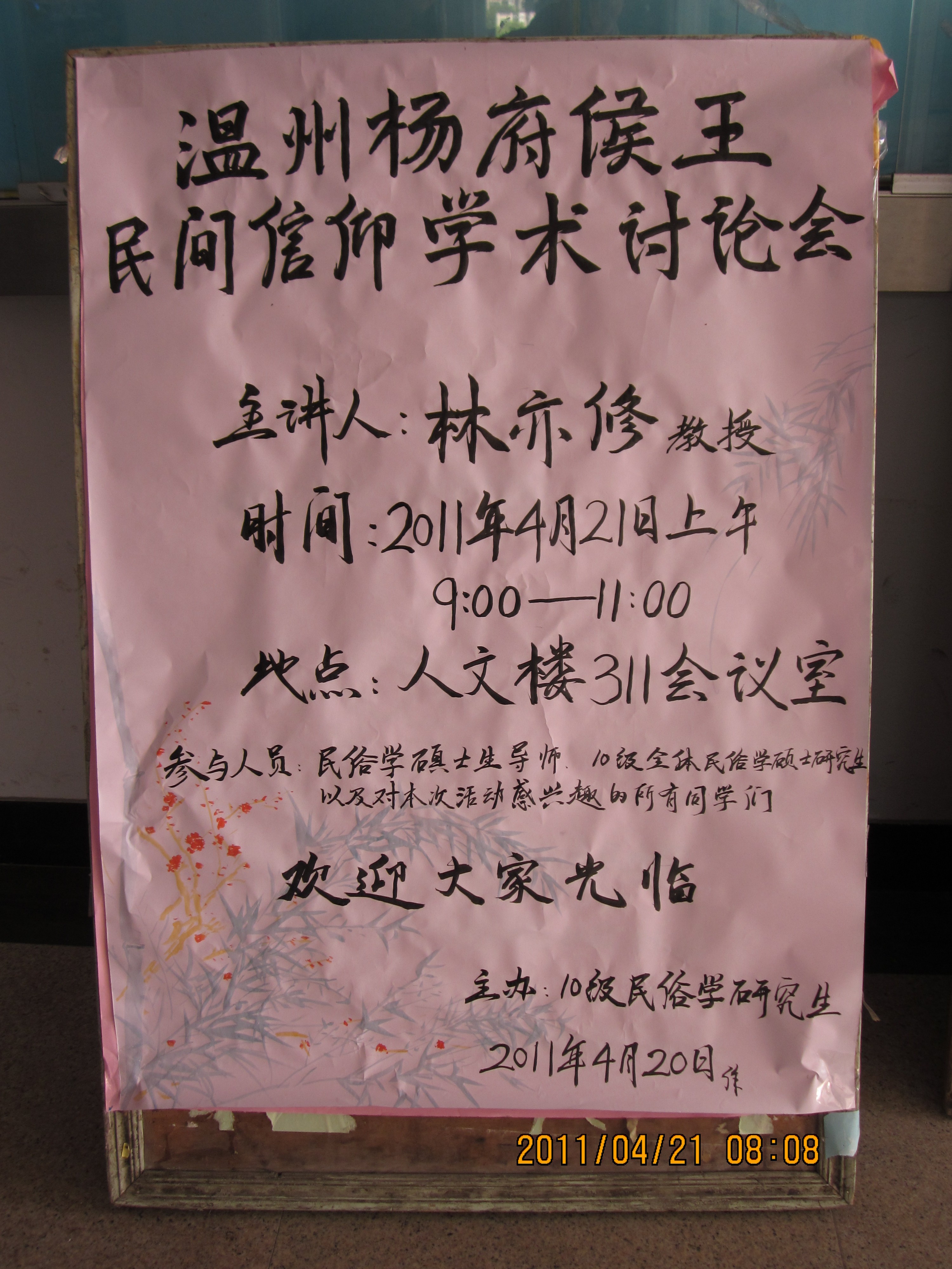 2011年4月21日上午9:00-11:00,九色視頻 10级民俗学研究生迎来了自己灿烂的学术之春。在九色視頻 311会议室,由2010级民俗专业主办了温大历史上第一场自主学习,主题为《温州杨府侯王民间信仰学术讨论会》的民俗研究学术沙龙。