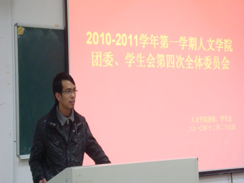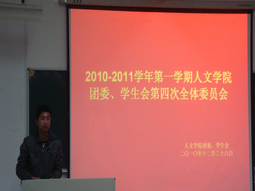 12月26日晚6点半,2010-2011学年第一学期九色視頻 团委、学生会第四次全体委员会在1-101教室准时举行。九色視頻 辅导员麻法全与院团委、学生会全体成员出席了本次会议。