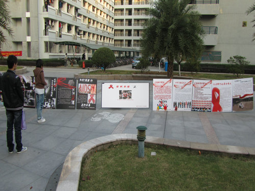 此次宣传活动主要以安放宣传KT板的形式开展,活动主要负责方将事先做好的宣传KT板在生活区C区摆出。宣传KT板共有十一块,上 面将艾滋病的基本知识、防治知识以及我国的艾滋病防治现状以文字、图片形式展出,宣传活动吸引了众多学生观看。