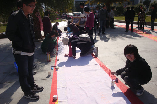 作为中国共产党领导下的一次大规模学生爱国运动,“纪念一二•九”精神值得大学生学习。本次的“纪念一二•九”涂鸦活动中,由各班派出的代表们一齐在洁白的横幅上以“纪念一二•九”为主题画出自己的风格,画出自己的个性。将近一个小时的作画过程精彩纷呈,同学们各展才能,横幅上不同的绘画作品因着共同的主题而形成一个和谐整体。