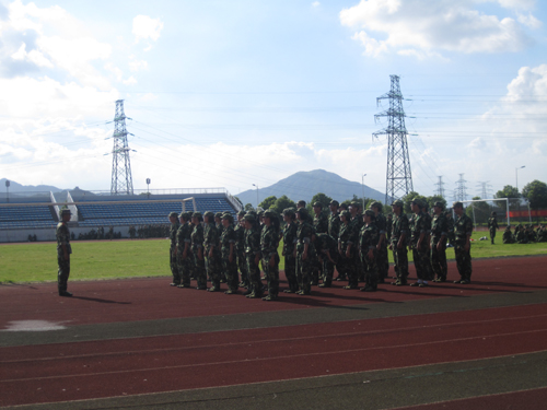 全体09届学员在南校区和北校区的体育场继续进行为期六日的军事训练。来自温州武警支队的教官带领同学们进行操练。