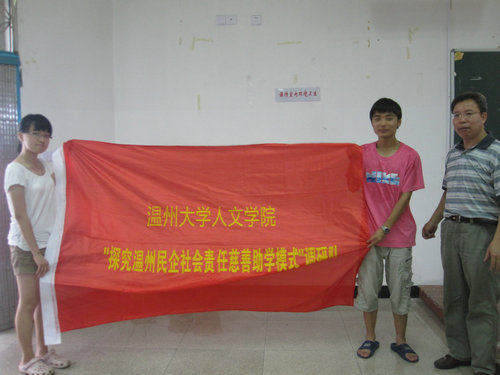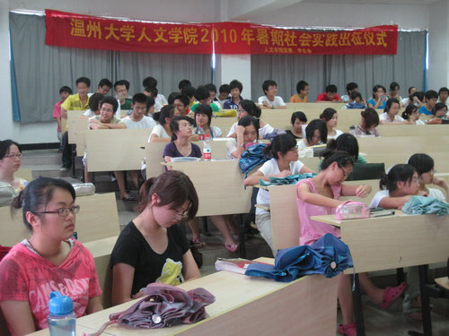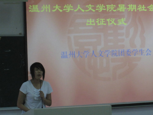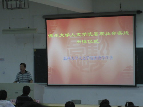 历年来进行的暑期社会实践活动作了基本介绍并给予大力肯定。接着院党总支书记周剑平进行了暑期社会实践活动的动员讲话,着重强调了活动中需注意的人身、财产安全问题。之后,由院实践队代表罗倩倩发言,讲述了她对暑期社会实践活动的感受与期待。最后进行的是院重点团队的授旗仪式,院党总支书记周剑平分别为“探究温州民企社会责任慈善助学模式”、“寻找逝去的古城”及“探寻泰顺特色文化”暑期社会实践队授旗。