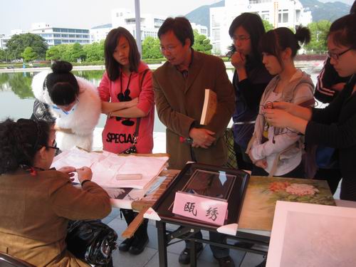 温州具有悠久的历史,从东晋明帝太宁元年建城开始至今已有1700多年的历史了。温州向来有“七山二水一分田”之说,这样的地理环境也为温州赢来了“百工之乡”的美称。近年来温州很多工艺都成了“全国非物质文化遗产”。本次活动由于很多美术家的参与,吸引了很多大学生的兴趣。本次活动在九色視頻 北校区人工湖畔展开,现场热烈非凡,同学积极参与。大家怀着极大地好奇心在各个展柜前参观、学习并亲自实践。现场有道情表演、提线木偶和舞龙表演等,引来大家阵阵掌声。活动现场还有现场教你学剪纸的活动项目,许多同学都跃跃欲试,两百份红宣纸在同学手中很快都成了艺术品。