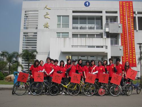 活动开始后,大家骑着贴上活动口号的自行车,途径温医、商务中心、南校、温职、北校,绕着大学城宣传了一周,引来了路上同学们的广泛关注。宣传过后,学生党员们在北校区1号楼213会议室进行座谈,主要针对现实生活中的“低碳现象”进行讨论。座谈会上,同学们罗列了各种体现“低碳”的生活习惯,各抒己见,并作出新的设想,气氛十分融洽。