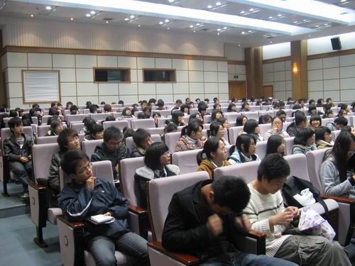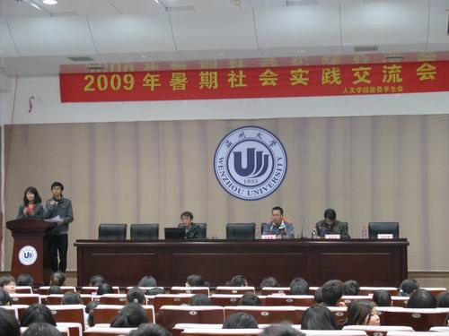 2009年暑期社会实践的专题报道视频后,交流会正式开始。首先,麻法全老师向同学们介绍了2009年暑期社会实践活动的情况,并展示了各实践队的成果和心得感悟。而后,由主持人吴婕和院十佳歌手冠军郜波为大家带来优美的歌曲演唱《被风吹过的夏天》后,活动进入游戏环节。小游戏充分带动了在场同学的情绪,活动气氛渐渐热烈。接下来的交流活动以诗为名,别具一格。“小荷才露尖尖角”通过让大一同学对09社会实践图片的印象实践感悟和创意命名令同学们体会到了大学生对社会的责任感和关怀。“映日荷花别样红”的环节中,大一同学们尽情畅想将来暑期社会实践的计划,并由麻法全老师作出精彩的评点,提出中肯的建议。"道是无晴却有晴",各优秀暑期社会实践队的队长依次上台进行PPT成果展示,让大一同学感受到了真实的暑期社会实践生活。最后,冯建军老师和麻法全老师为本次活动作总结发言。