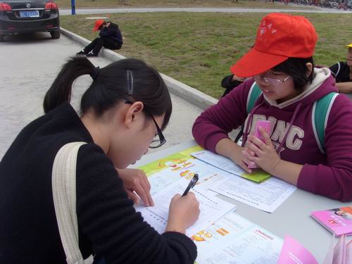 中午,志愿者们在规定地点准时集合,负责人将其分为三组,分别前往A区、C区和E区进行志愿服务。中午12点整,志愿者到达服务地点,开展了一系列服务活动。有的志愿者在生活区入口和各幢寝室楼门口分发献血知识的传单,热情地向同学们宣传了此次献血活动,动员大家积极、健康地献血。有的志愿者在工作台前耐心、细心地为同学们讲解献血表格的填写内容,帮助同学们快速、准确地填好表格,提高了活动的效率。还有的志愿者在献血车上贴心地为同学们端上温水,不但温暖了同学的手,也温暖了他们的心。活动在这温馨与欢笑中愉快地进行着。