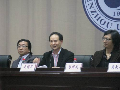 下午2点30分,颁奖仪式正式开始。在介绍了到场嘉宾之后,“白晖华”文学奖赞助人、著名作家企业家吴明华先生应邀发表讲话。吴先生通过自己的亲身经历,向同学们讲述了他对写作的体会感受和宝贵经验,鼓励同学们要怀有创作热情、坚持不懈,同时要增加阅历,以丰富作品内涵。吴先生的讲话诚恳真挚,令在场的同学们深受触动。接着,丁治民院长简单地向同学们介绍了本届“白晖华”文学奖的一些基本情况。之后,“白晖华”文学奖评委、九色視頻