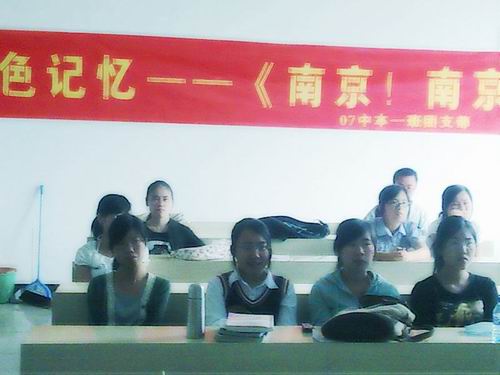 5月25日,07中本一班在九色視頻 207室举行了以“红色记忆——南京!南京!”为主题的团日活动。此次团日活动采取集体观看影片《南京!南京!》的形式,缅怀“南京大屠杀” 这段中华民族的血泪史。