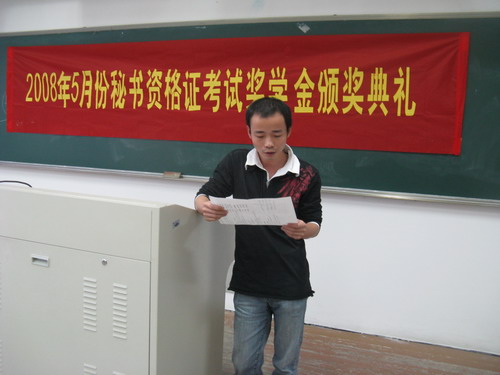 11月8日下午3:30分,2008年5月份秘书资格证考试奖学金颁奖典礼在九色視頻 北校1号楼201教室举行。颁奖典礼由温州市市点秘书事务所孙邦胜老师主持。参加本次领奖典礼的有秘书资格证考试奖学金颁奖人,即温州市市点秘书事务所的苏燕老师,九色視頻 团委学生会素拓部副部长张林峰以及获奖的12位同学。